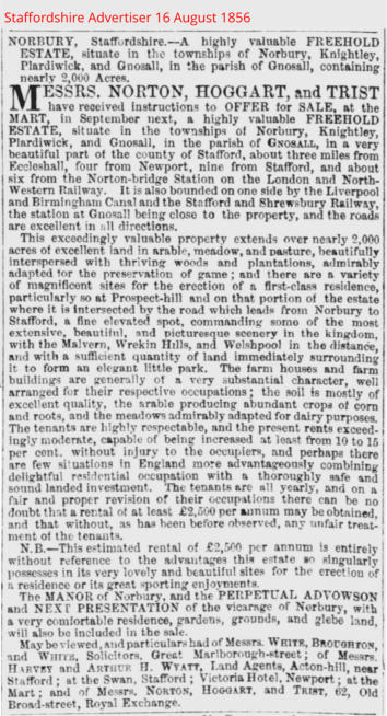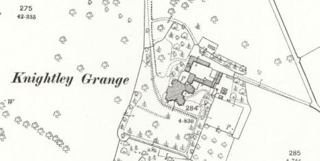 The site of Knightley Grange was owned on the Tithe survey in the late 1830s by the Earl of Lichfield. In August 1856 an estate of 2000 acres was advertised for sale by auction in September of that year (see newspaper article). It was described as “a highly valuable freehold estate situate in the townships of Norbury, Knightley, Plardiwick and Gnosall”. The sale particulars (Stafford Record Office D615/ES/4/12) advertised several farms together in one lot. The land sold to Mr Hargreaves amounted to about 580 acres. This is calculated from the land owned by his son’s widow Rose Hargreaves on the 1910 Finance Act (see plan), and which confirms the 1856 Sales particulars held at Stafford Record Office, so it appears that the original 2000 acres sale was divided and it is not clear whether his purchase was concluded at the auction or at a later date. The site for the building of Knightley Grange property was on that of Cob Hall Farm (plot 417 on Tithe Map). A relevant section of the 1838 Tithe map and later OS map from 1880 have been merged in the comparison (shown by the link on the right). Note the the orientation of the Tithe map is not North-South as indicated by the angle of the 1838 text. As can be seen in the comparison the adjacent roadway was changed and a sweeping driveway laid to the west side with a service access to the east. Cob Hall Farm comprised 105a, 0r, 7p perches of land in 1856 and was in the tenancy of John Skellorn. Skellorn’s tenancy of Cob Hall Farm was recorded in the Gnosall rate books maintained by parish overseers of the poor. Details show that in April 1860 the owner was Earl of Lichfield and a few months later in August, the owner was Hargreaves. However, the land area had reduced to 97a, 2r, 4p on both records. Maybe Hargreaves had made an arrangement to occupy some of the estate earlier or until Skellorn’s tenancy had expired thus allowing building work to commence. In January 1861, the Gnosall rate books indicate that Hargreaves is the occupier as well as the owner. There are no dates when the Grange was built but what may help is to track the whereabouts at that time of Robert Hargreaves. He was residing in the late 1840s at Johnson Hall just South of Eccleshall and it is from that address it is assumed he negotiated the purchase of the estate from Earl of Lichfield. Newspaper articles (shown by the link on the right) from 1859 show that he was at the Hall in July. Johnson Hall was sold in August and there was a 3 day sale of contents in September “the property of Robert Hargreaves Esq”. Some 12 months later on 16 December 1860 his son Robert Halstead Hargreaves was born at Leamington Priors, Warwickshire. The newspaper announcement refers the father as Captain Hargreaves, Norbury Manor. So it appears that the family might have moved to Norbury Manor which was included in the estate that Hargreaves purchased. However, The 36, Lansdown Place, Leamington Priors address is a mystery. Robert Halsted was christened at Leamington Priors in February 1861 and the whole family was there on the 1861 census. In June 1861 Robert was back in the locality attending a dinner at Walton Grove, Eccleshall of the “Eccleshall Rifle Volunteers” where the chairman in his speech said: “it gave him great pleasure to see Major Hargreave’s face once more amongst them, and he hoped that ere long he would settle in his new home as one of the resident landed proprietors of the county”. The earliest evidence of occupancy was a newspaper report dated 25 January 1862 of a ball. A list of patrons included “Major Hargreave, Knightley Grange, Eccleshall”. He built his imposing country house “in the Tudor style”, Knightley Grange. The original house had tall Tudor chimneys, a tower, mullioned windows and projecting bay windows topped by balconies. The property remained in the Hargreaves family for over 100 years until it was sold with most of the estate in 1967. Some properties were retained by the family. Knightley Grange was never lived in again after that date. 1967 - It was bought by a farmer Brian J Dale from Ludlow who demolished the tower as it was unsafe and started work doing structural alterations, but these were never completed. In 1992 Knightley Grange and the majority of the estate was sold to Lichfield Estates who didn’t do anything to it. Then in 2007 it was bought by a large property investment company Granger PLC. In 2009 they sold it to the present owner. At that time, Country Life magazine wrote: “Uninhabited now for a number of years, Knightley Grange is in a pretty rundown state, although wind- and weathertight, and according to selling agent Tony Morris-Eyton, wired and plumbed to ‘first fix stage’. Shrewsbury-based architect Graham Moss has produced an impressive set of drawings indicating how the house and its courtyard of ancillary buildings could look once restored. It makes an appealing picture, at an estimated construction cost of £1m-plus.” The building was demolished in 2019.