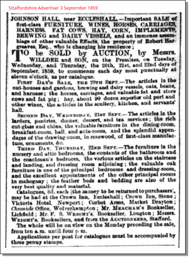 Major Robert Hargreaves was born in Manchester in 1818. He was living at Johnson Hall, Eccleshall since the late 1840s and was a local JP. It is not known what brought Robert to Eccleshall and gave him entry into Staffordshire society. He was active with the Staffordshire Militia and Staffordshire Rifle Volunteers – with whom he was popular – and seems to have been called up for the Crimean War and then the Indian Rebellion of 1857-8 though it’s unlikely he went overseas. His wife Sarah Anne nee Clegg was the daughter of wealthy Lancashire mill owners. The Clegg family, of Butt Hill, Prestwich, had a weaving shed at Besses o’th’Barn, owned Vale Mill in Heywood and also had a warehouse on New Brown Street in Manchester (rented from Hargreaves). Robert and Sarah Anne married on 8 March 1849 and had four surviving children, Ellen Gertrude Grant, born Eccleshall 1854, Elizabeth Maud, born Eccleshall 1859, Robert Halstead Hargreaves (who inherited the estate), born Leamington Priors 1861, and Ada Mary, born Knightley 1863 and baptised at St Lawrence. During his married life Major Hargreaves continued to sit as a JP and on the Stafford Grand Jury. He and Mrs Hargreaves attended a meeting in Eccleshall in 1854 for Prince Albert’s Patriotic Fund to raise money for the widows and orphans left by the Crimean War, and in 1859 a fete was held in the grounds of Johnson House to raise money for Eccleshall library and reading room. The Hargreaves daughters all left Knightley with two of them making socially advantageous marriages. Major Hargreaves died aged 62 on 28th October 1880 and was buried at Knightley. The chancel extension, vestry and choir aisle at Christchurch, Knightley, were built 1882-1883 in his memory. His widow Sarah Anne continued to live in Knightley with her daughters. Her son Robert Halstead Hargreaves (Jnr) returned to live at Knightley Grange after marrying Rose Harriet Steward, a vicar’s daughter, in Gloucestershire in 1886.