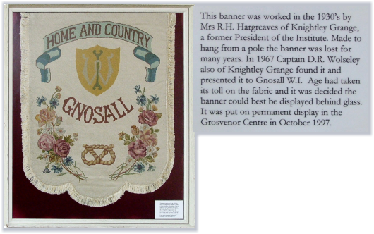 The Hargreaves were clearly genially disposed towards the local community. From the early 1880s the children of Knightley School (about 100) had an annual school feast at Knightley Grange, organised by Mrs Hargreaves Snr. It began with games on the front lawn, followed by cake and tea, and more races in the park (with prizes for all) ending with a paper chase. The annual school treat at the Grange was carried on through the 1930s along the same lines. In June 1940 Rose Hargreaves, as President of Gnosall W.I., invited the members to visit the house and gardens, and after Rose’s death, Violet and Ruth organised treats for the Sunday School pupils in the 1940s. Rose embroidered a banner for the WI in the 1930s. It is on show in the ‘Grosvenor Centre’ in Gnosall. Click here to view In 1946 Knightley Grange, “well alight”, was used for practice by the National Fire Service, with six appliances and nearly 40 firemen taking part.