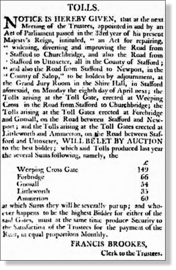 In April 1795 the Clerk to the Trustees, Francis Brookes (a Stafford solicitor) put an announcement in the Staffordshire